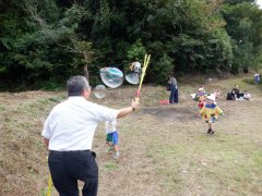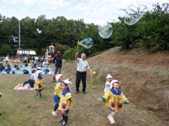 園長先生のシャボン玉にみんな夢中になって追いかけていました。