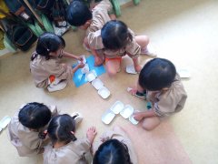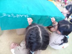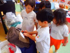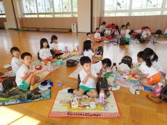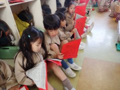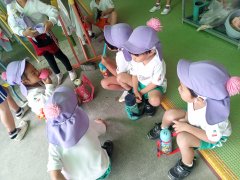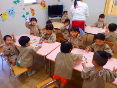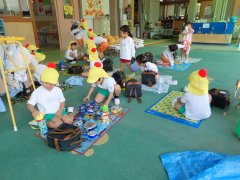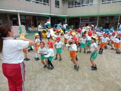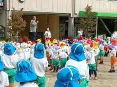 園長先生から「風邪コンコンのバイキンマンがみんなのお腹や喉を狙っていますよ。手洗いうがいをしっかりしましょう。そして先生が〝お茶タイムをしましょう”と言った時には、喉が渇いていなくてもお茶を飲みましょうね。カラカラの喉がバイキンマンは大好きなんですよ。」とお話がありました。