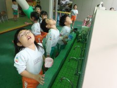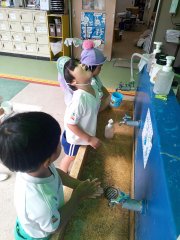 園長先生のお話をしっかり守って、お茶をしっかり飲んだり、うがいを進んでしているお友達。