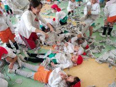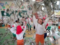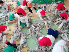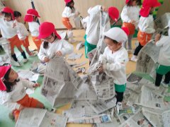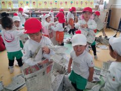 新聞紙をちぎったり、お布団にしたり、紙吹雪を作ったりしておうちではなかなかできない遊びを楽しんでいましたよ!