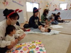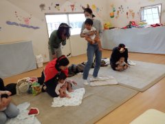 今月もママもしっかり体をほぐして、赤ちゃんも股関節を柔らかくする姿勢をとって、ニコニコでマッサージをしました。