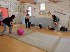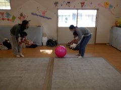 お友達のお名前を呼びながらバランスボールをパスして遊びました。