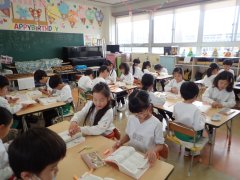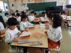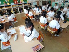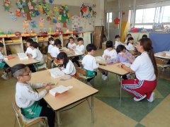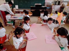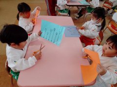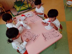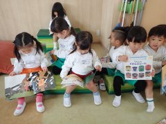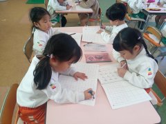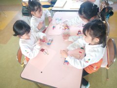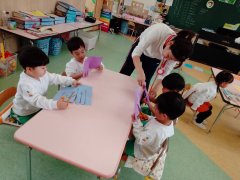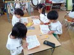 お部屋ではひよこちゃんがハサミにチャレンジしたり、年長さんは辞書引きをしていました。