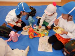 一緒にお弁当を食べました。シートの上でピクニック気分です❤