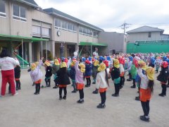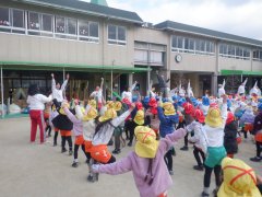 担任の先生とお友達と力を合わせて頑張れるように「エイエイオー👊」と気合を入れていました。