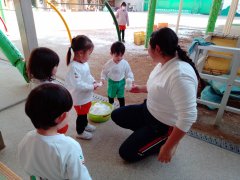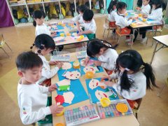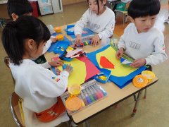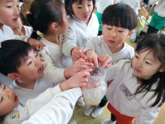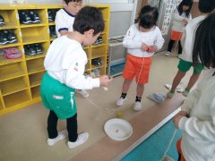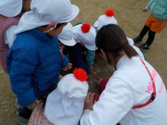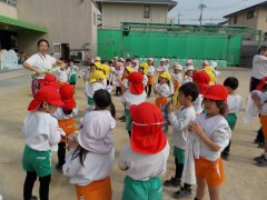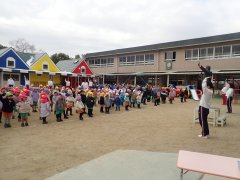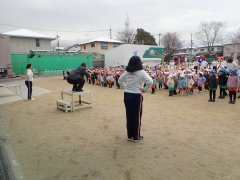 朝礼では「人間は他の動物と違って2本足で歩いたり走ったりします。人間の足には大きい筋肉がついていて、しっかり動かすと体がポカポカ暖かくなりますよ!」と園長先生がお話して下さいました。みんなでスクワットをしました。