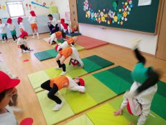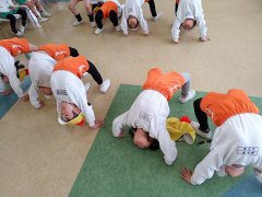 次は2クラスずつに分かれて、室内で跳び箱、保育室と園庭ではドッジボールです!